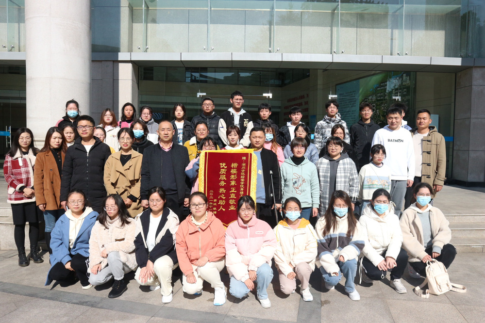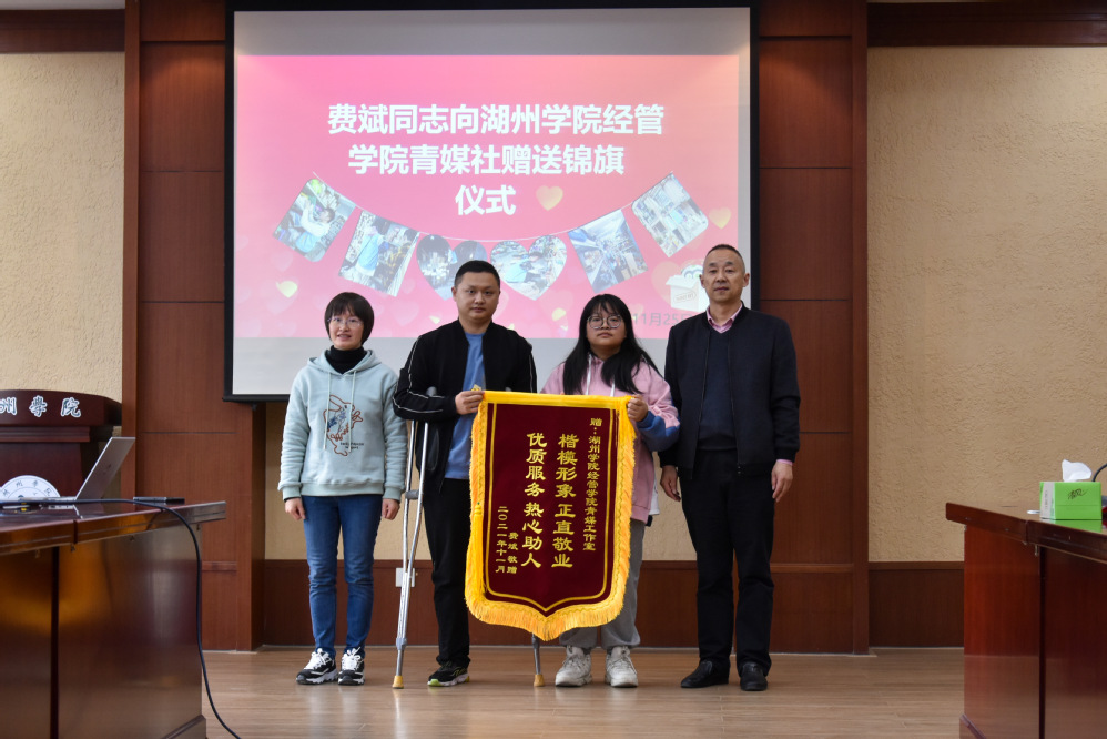 11月25日,beat365平台于明知楼204会议室举行费斌同志向beat365平台青媒社赠送锦旗仪式。beat365平台党委副书记宁培龙、自强创业人费斌出席,beat365平台青媒社指导教师吴为英、beat365平台全体辅导员以及青媒社的志愿者们参加此次仪式。本次仪式由学工办主任吴艳主持。
