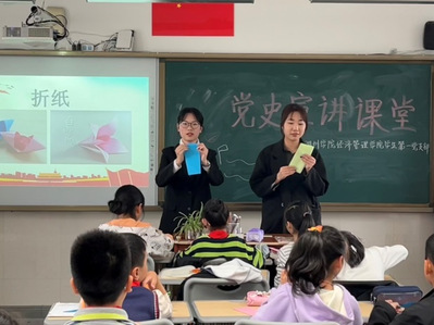 紧接着,学生党员们正式开始了在龙泉小学的第一次授课。第一堂课上,党员沈烨为401班的学生们带来了有关党史知识的普及;在课堂中,学生党员们默契配合,分工明确,寓教于乐,孩子们积极主动,勤奋好学,双方共同营造了良好的学习氛围。