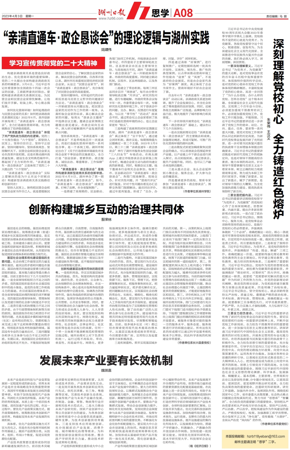 2023年4月3日,《湖州日报》思学版全文刊登我院副教授陆建伟的理论文章《“亲清直通车·政企恳谈会”的理论逻辑与湖州实践》,就“亲清直通车·政企恳谈会”的理论逻辑以及湖州市的具体实践。