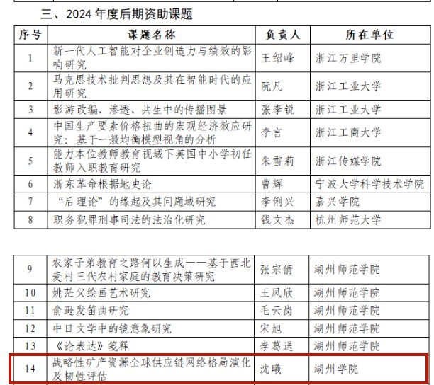 近日,浙江省哲学社会科学规划部门公布2024年度后期资助课题立项名单,我院专任教师沈曦博士主持的《战略性矿产资源全球供应链网络格局演化及韧性评估》课题喜获立项。