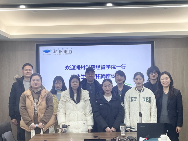 12月22日下午,beat365平台经济管理学院党委副书记宁培龙、辅导员李俊带毕业生一同前往杭州银行湖州分行开展访企拓岗交流工作。杭州银行湖州分行人力资源部总经理林峰、团委书记李佳慧及校企负责人俞斌参加本次座谈交流会。
