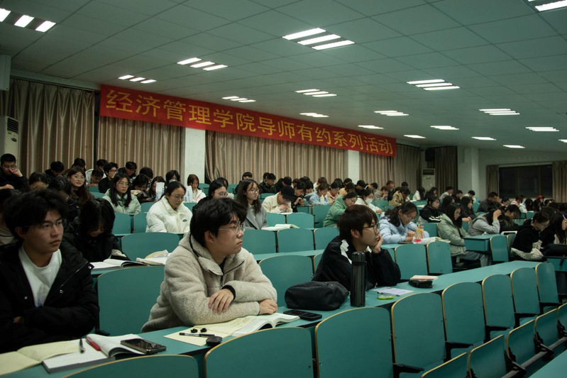 讲座上,姚金海向同学们分享了自己大学以来的求学经历、经验和感悟。并以全球典型的经济金融事件为例,指出经管学子提升学科专业素养的重要性与必要性。对于今后的大学生活,姚教授对同学们提出了四点建议:第一是读万卷书,多读书,学会理论联系实际;第二是行万里路,做到“知行合一”、“动与静”的平衡;第三是要学一两门本领,大学期间尝试考取一门资格证书、参加一项学科竞赛;第四是做好一两件事,及早制定个人职业生涯规划,为自己设定一两个目标全力以赴。