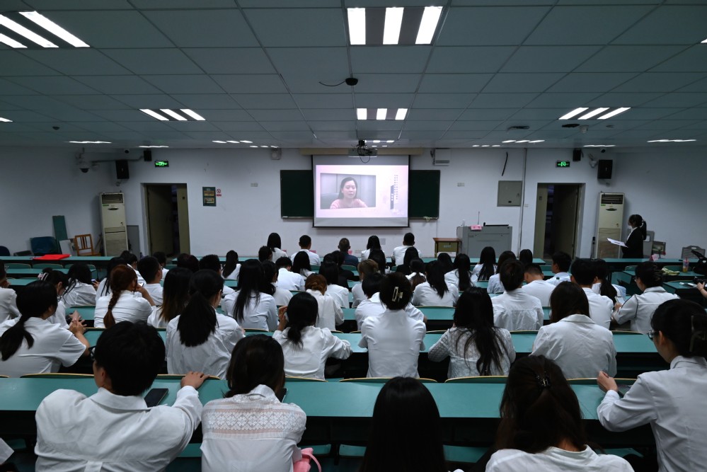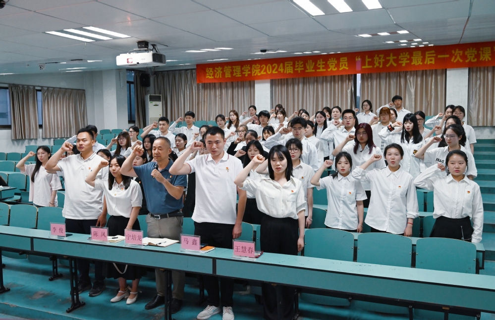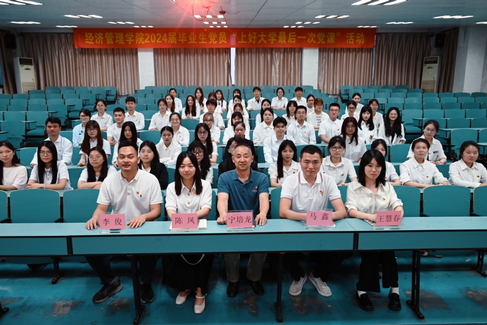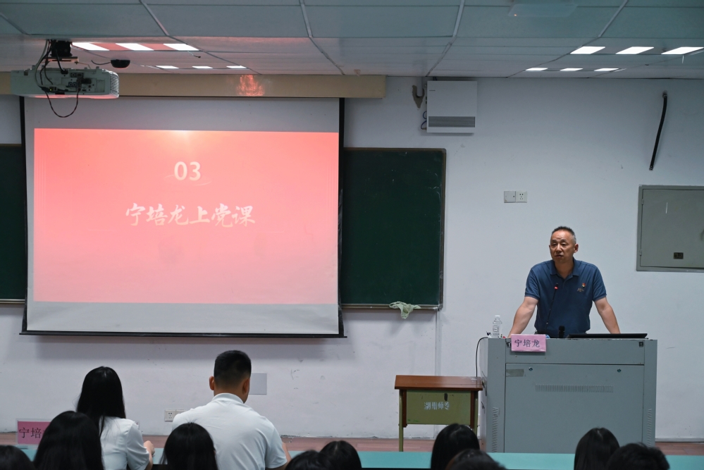 最后,宁培龙以《不忘初心再出发,青春建功新时代》为主题,为毕业生党员送上了一堂内容丰富的党课。他结合当前国家发展大局和青年成长成才的需求,勉励毕业生党员以“四要”加强终身教育:一要坚定理想信念;二要重视自己的党员身份;三要努力为群众办事;四要扣好人生的第一粒扣子。在授课的最后,宁培龙祝福各位毕业生党员发展越来越好,以实际行动和更加优异的成绩为党旗和母校增辉!