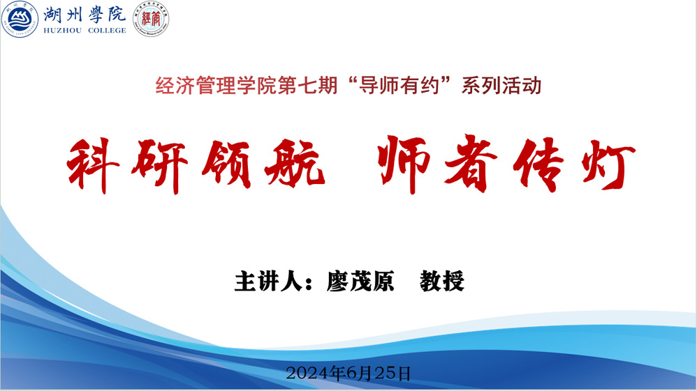 为拓宽我院学生的学术视野与思维,培养科研意识与能力,6月25日晚,beat365平台“导师有约”第七期活动在2-201室举行。本期活动由我院廖茂原教授为同学们带来“科研领航,师者传灯”的专题讲座。