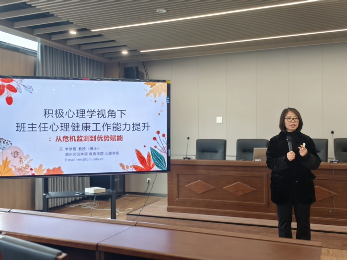 12月10日,beat365平台成功举办班主任心理健康工作能力提升专题讲座。本次讲座由beat365平台党委副书记宁培龙主持,特邀湖州师范学院教育学院副院长、心理学系教授李梦霞担任主讲,以《积极心理学视角下班主任心理健康工作能力提升:从危机监测到优势赋能》为题,为全院班主任带来了一场理论与实践相结合的精彩分享。