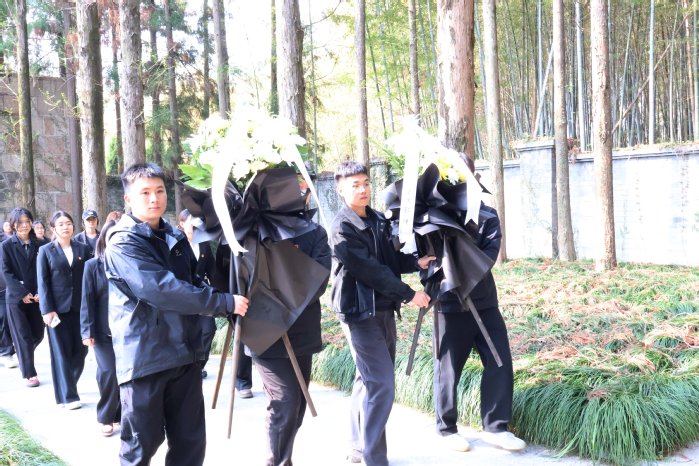 参观结束后,庄严肃穆的祭奠仪式在革命烈士纪念碑前正式开始。学生代表稳稳抬起花篮,缓步走向纪念碑,将花篮敬献于碑前。全体师生面向纪念碑,神情庄重,深深三鞠躬,表达对革命先烈的无限哀思与崇高敬意。