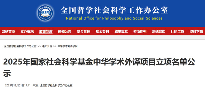 国家社会科学基金中华学术外译项目是国家社科基金项目的主要类别之一,旨在资助代表中国学术水准、体现中华文化精髓、反映中国学术前沿的学术精品以外文形式出版,有助于深化中外学术交流与对话。该项目立项评审严格,学术质量要求高,是衡量高校哲学社会科学研究国际传播能力与学术影响力的重要标志,具有很高的学术含金量与社会影响力。