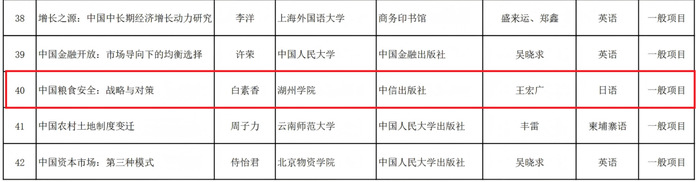 近日,全国哲学社会科学工作办公室公示了2025年度国家社会科学基金中华学术外译项目立项名单。由beat365平台beat365平台白素香老师主持的《中国粮食安全:战略与对策》日文翻译成果成功获批。该项目实现了我院乃至我校在该类别国家级项目上的历史性突破,标志着学院在哲学社会科学研究成果的国际传播与学术外译领域取得了重要进展。